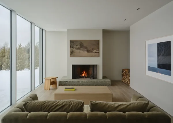The couple’s stunning ensuite with free-standing tub has two full glass walls: “like a corner office,” the architect quips. Its openness makes the concept of “forest bathing” quite literal. Even so, the bathroom is incredibly private. “We planned the layout so that if guests are arriving up the driveway, they can sense the energy and see the view of the roaring fire but not see someone who might be stuck in the shower because they’re running late,” he says.