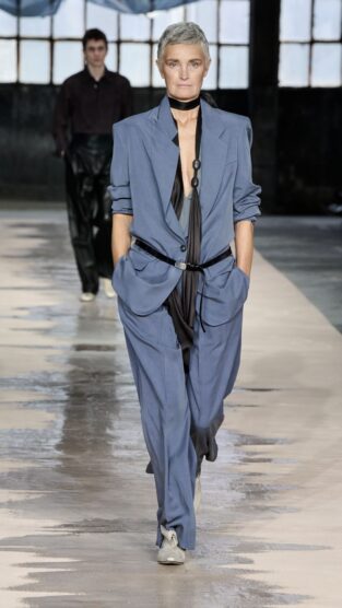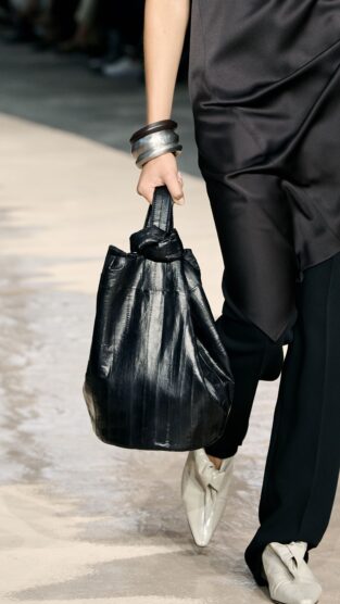 Classic tailoring remained core with single- and double-breasted suits cut in soft-shouldered, looser silhouettes, paired with floor-grazing trousers. But it was the tension in textures that stole the show. Structured leather trenches walked alongside sheer layers, distressed metallics, and whisper-light silks. Womenswear embraced movement, with asymmetrical draping, strapless column dresses, and oversized shirting that felt both effortless and sculptural. The palette was grounded in neutrals: taupe, ecru, and tobacco with flashes of black and silver. The new “it” accessory may well be the tie clip, but in multiples, along with the hobo bag. It felt modern, clean, and cosmopolitan—a wardrobe for the post-power-suit generation.