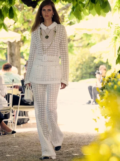 A cinematic light enchanted at the splendid Villa d’Este, where Chanel held its Cruise collection. In the oasis of beauty of the 16th-century villa, there was an atmosphere of je ne sais quoi meets la dolce vita. The handwritten invitation on Villa d’Este stationery announced a “show on the terrace,” where among an audience mostly made up of Chanel’s biggest-spending clients and brand ambassadors, including Keira Knightley, Sofia Coppola, and Caroline de Maigret, enjoyed dolce far niente. The show is one of the last curated by the Chanel Creation Studio before Matthieu Blazy’s debut in October and had all the hallmarks of the maison—tweed, camellias, handbags, pearls, and layered chains—so it was familiar, and safe, territory. From taffeta to tweed, chiffon to suede, beach club to cocktail dresses and evening suits, the collection and the event as a whole captured all the good and great of Italy.