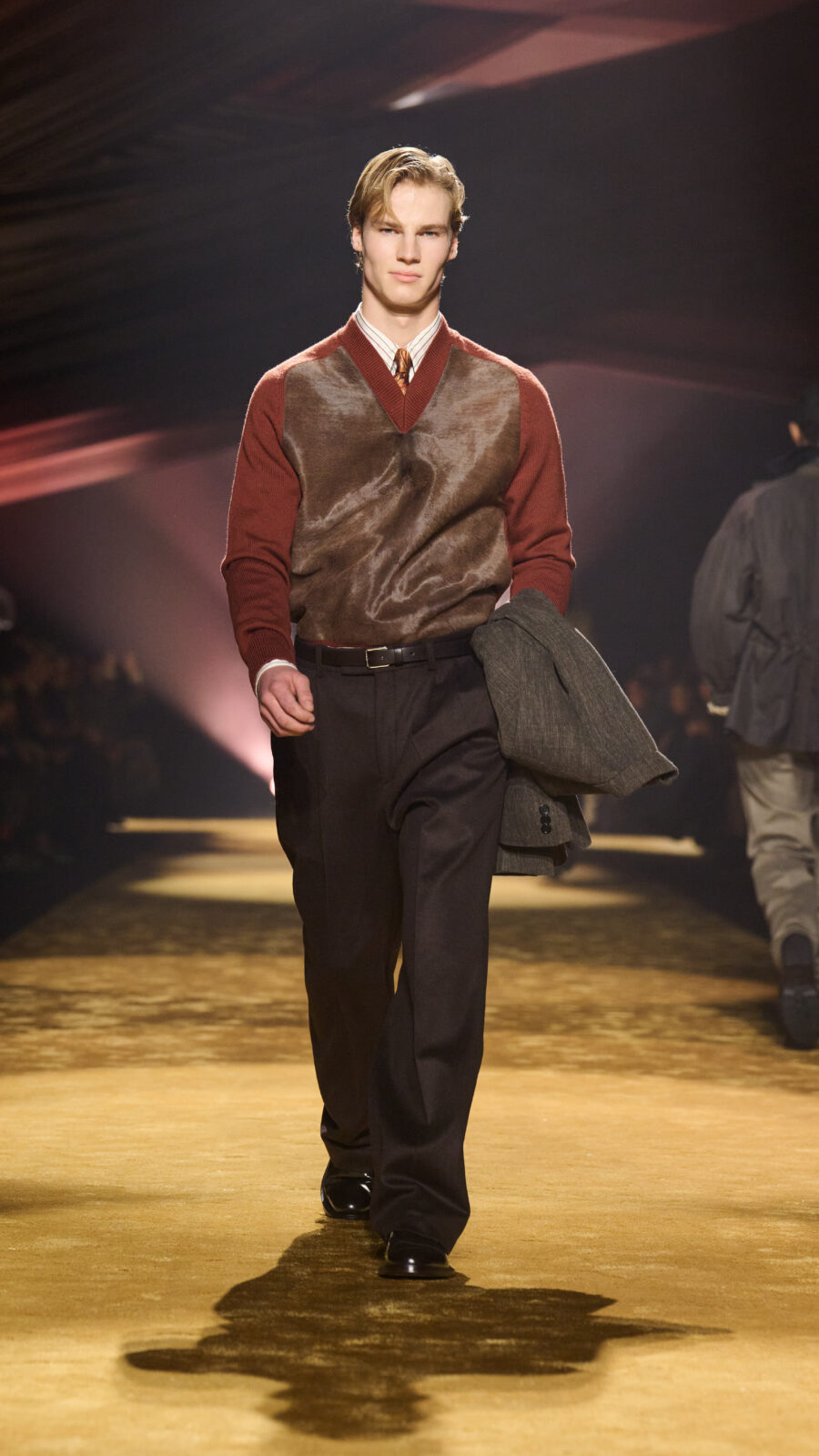 Archival silhouettes were revisited and refined; late-1980s proportions, reimagined with assertive shoulders tapering into sculpted waists. Double-breasted jackets were paired with softly pleated trousers, styled with an ease that sidestepped anything resembling corporate uniform. Fine-gauge knits replaced traditional shirting. Leather, in particular ostrich, played a pivotal role. Outerwear ran the gamut of floor-grazing overcoats to cropped bombers. There was a sensuality to the structure, expressed through fabric rather than flash. This was power dressing, liberated.