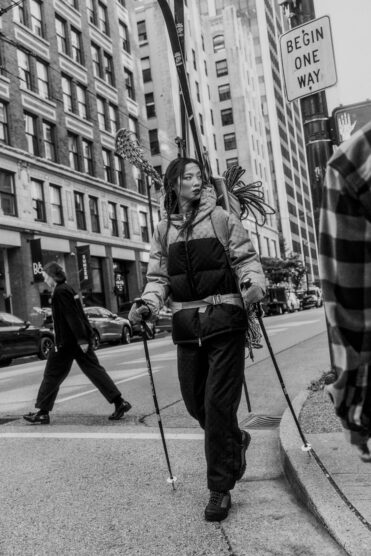 Veilance jacket and west; Nagnata leggings and Acne Studios toque, both from Holt Renfrew; Chanel ski glasses.
