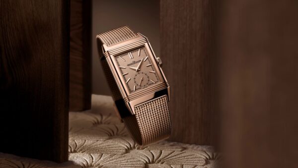 The Reverso story began in 1931, and over the decades many variations of the timepiece have been created. The distinctive design accounts for much of the Reverso’s enduring appeal, but this is the first time the art deco watch has been set on a Milanese bracelet. The fabric-like weave is made from intertwined gold threads, creating interlocking links—the bracelet would stretch to 16 metres if it were laid out link by link. The case, housing the Jaeger-LeCoultre calibre 822 movement, can remain black on the reverse side or be personalized with an engraving or lacquered decoration. This is vintage glamour for the modern wearer.