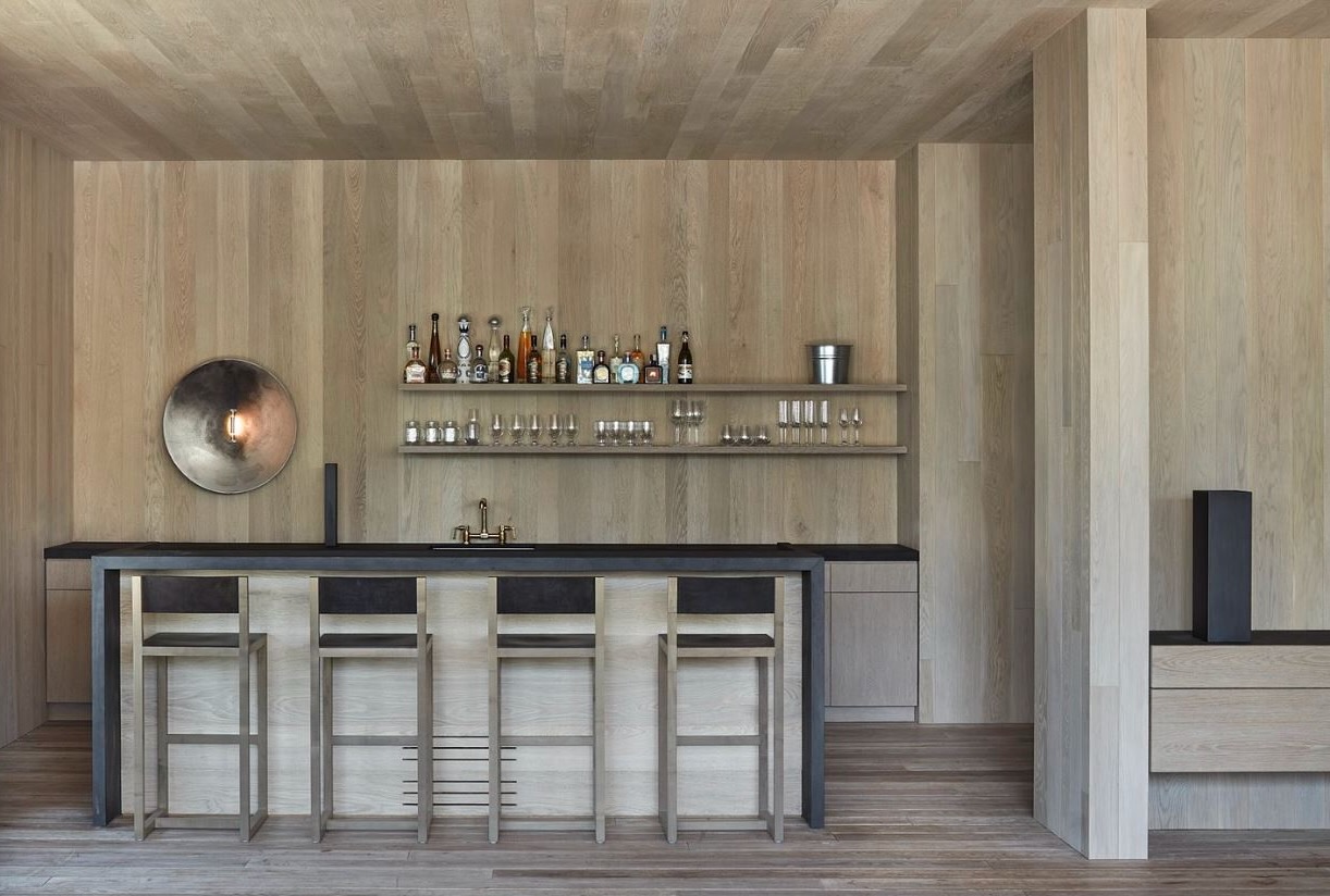 To further connect the house to its countryside setting, Akb clad the buildings in rough-sawn cedar boards and western red cedar shakes. Set under pitched roofs with deep overhangs, the houses have the materiality and form of vernacular cottages. The overhangs create outdoor shade, allowing the residents and their guests to indulge in indoor-outdoor living during the warm summer months. Floor-to-ceiling glass walls (some of which retract) reinforce the sense of connectedness to the surrounding landscape.