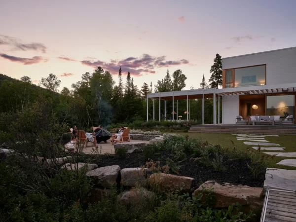 A red sand beach might not be high on the list of features you’d expect to find in rural Quebec, but that is what the site for this home designed by Ghoche Architecte offered. It sits on the shore of Lac Archambault in the village of Saint-Donat, which is flanked by a second large lake, Ouareau, on the other side. The surrounding Lanaudière area is popular year-round for skiing, hiking, and water sports.