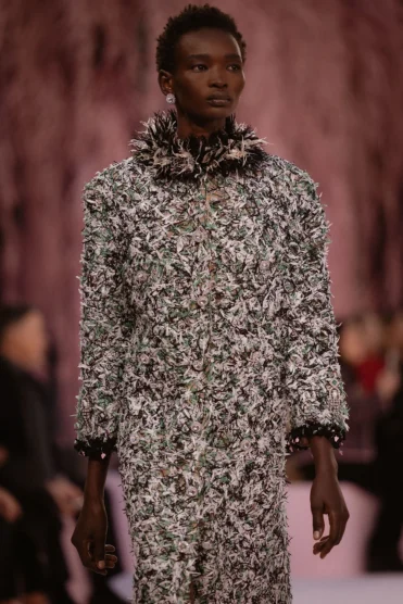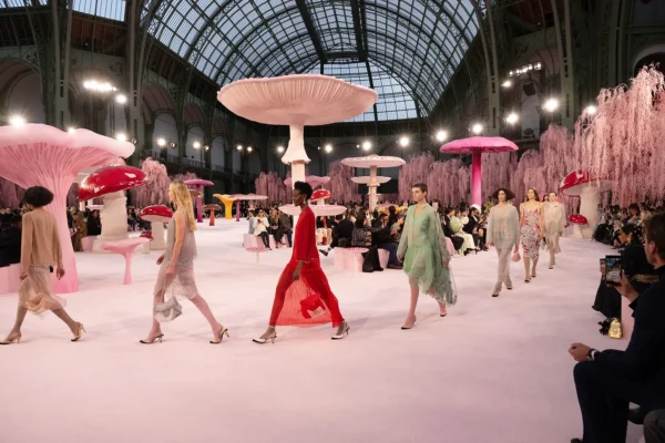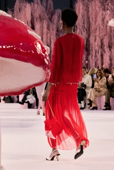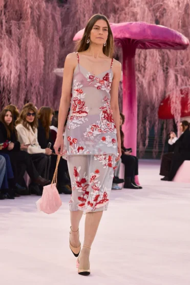 On Tuesday, beneath the soaring glass dome of the Grand Palais (a venue synonymous with the house’s most theatrical moments), Blazy set his debut couture show in a pink fairy-tale forest, a wonderland with looming magic mushrooms framed by pink weeping willows. When the first look emerged, Stephanie Cavalli in weightless mousseline, it signalled immediately that Blazy was reframing couture as something meant to be worn, not merely admired.