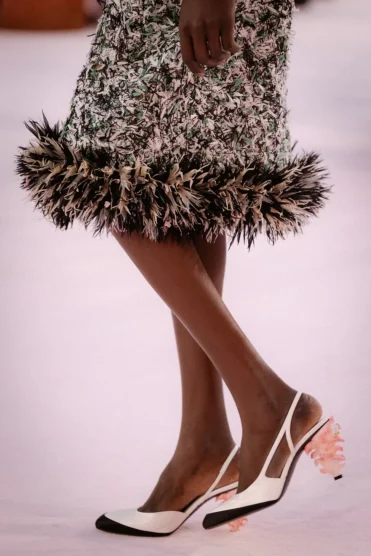 After the usual parade of daywear, with models of different ages, the collection really took flight. There were feathers, tweed coats, cocktail suits, sleeveless sheaths, beaded dresses, and a velvet blue and silver two-piece pant look that offered a counterpoint to the collection’s prevailing lightness. The final, signature look departed from the expectations of a classic couture wedding dress with Blazy presenting an oversized collared shirt and below-the-knee-length skirt made of mother-of-pearl scales. Shoes throughout the show translated the set into something wearable with mushroom heels.