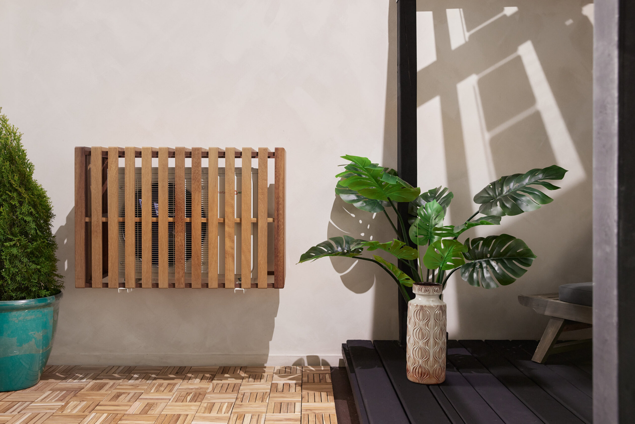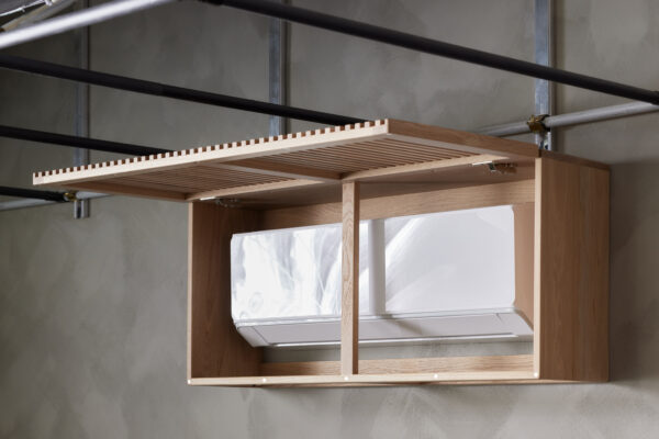 “Some details were a challenge, like the spacing of slats,” says furniture maker Mitz Takahashi, who designed the A/C and heat pump enclosure. “You want them to be small, but not too small, since it needs room for heat to escape.” The resulting structure is a mix of form and function, a complement to Takahashi’s existing furniture line rather than a clunky afterthought–something he says is currently more common in Japan than North America.