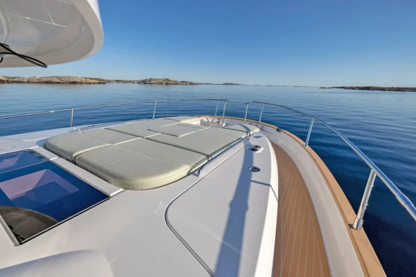Back on the main deck, the asymmetrical design of the 495 Fly yields a starboard-side promenade with access to the bow. There, a triple-wide, forward-facing sun lounge with raised wraparound views assures total relaxation.