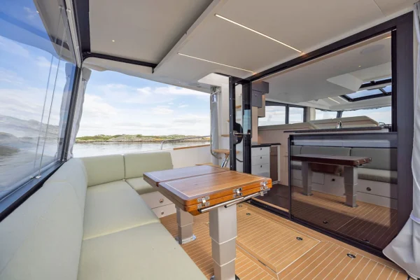 Opposite the helm is an additional lounging space, and between, a stairway leading to the belowdecks accommodation.