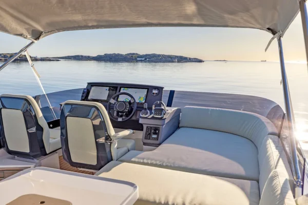 The helm also comes furnished with Volvo Penta’s Dynamic Positioning system and its assisted docking system, allowing even less experienced captains to dock like a pro in any weather.