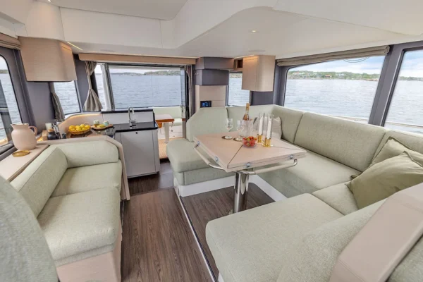 The yacht’s primary dining space sits to the port side immediately ahead and one step up from the galley, with a U-shaped booth dinette surrounding a large wooden table. A facing settee opposite creates a great spot for conversation once meals are done and conceals a large-screen TV that raises on an electric lift for late-night entertainment.