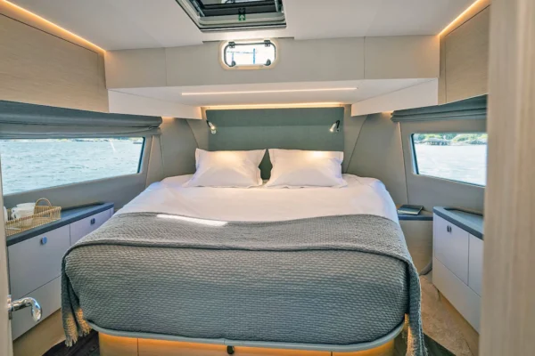 Far forward, the 295 Fly presents an inviting VIP suite with a central queen bed and plenty of space for clothes and gear. Guests will think you assigned them to the owner’s suite by mistake.