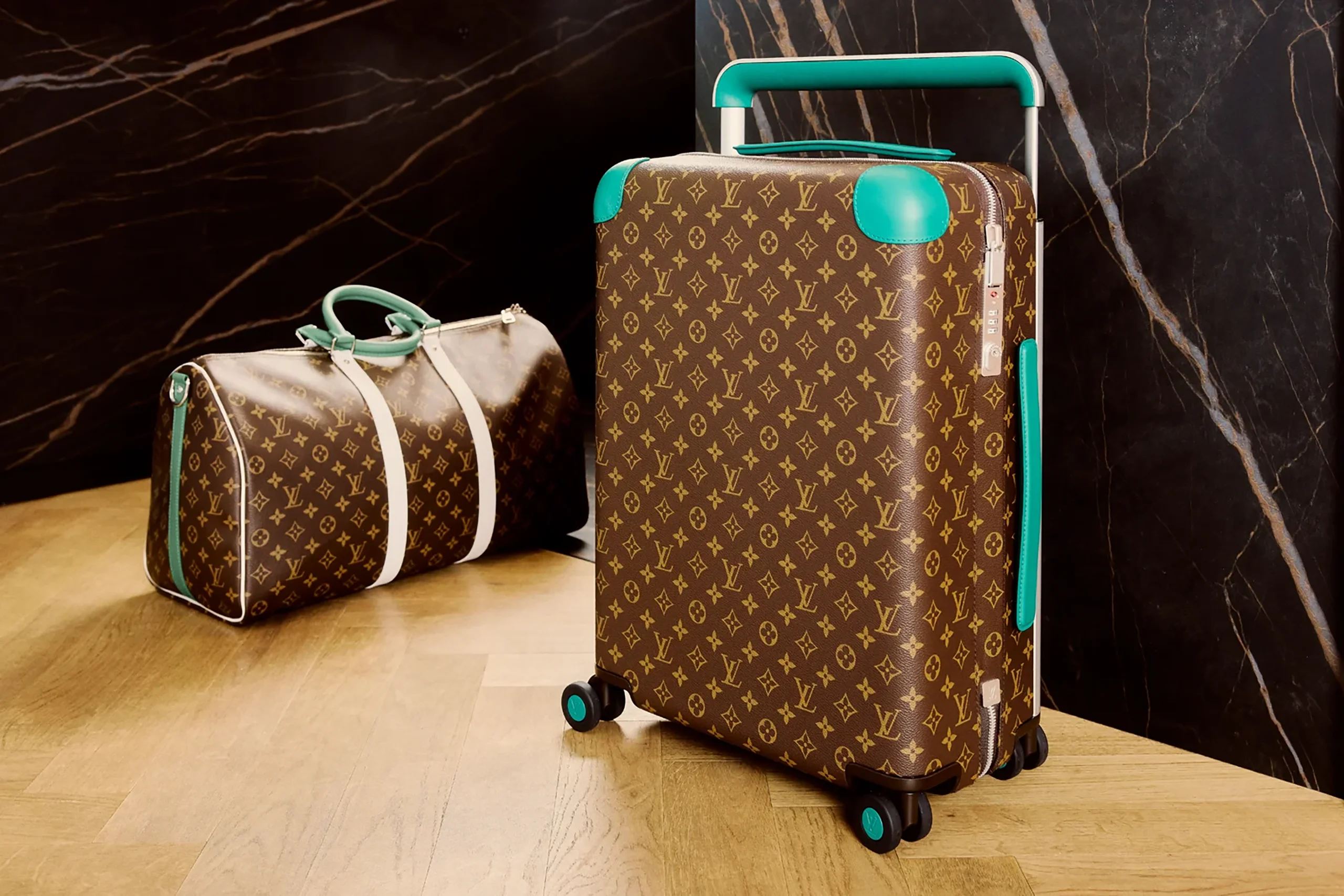 Louis Vuitton Trolley Horizon 55 and Keepall 50 monogram with Borneo Green accents.