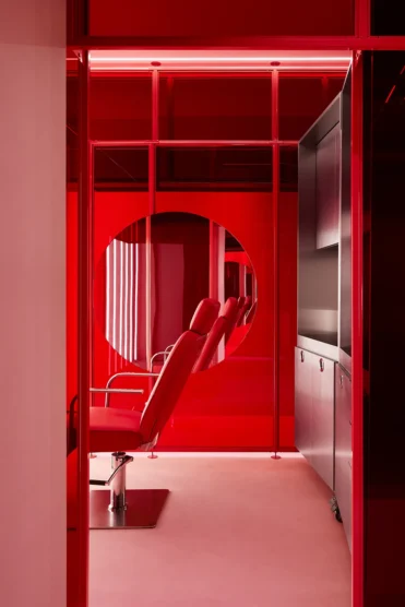 In a space not much larger than 800 square feet, a generous 19-foot-long stainless steel counter serves as reception, lounge, and even a place for seminars and training sessions. “She’s trying to get rid of the stigma of getting work done,” Simpson adds of the decision to challenge the typically isolating qualities of clinical spaces and waiting rooms, “so we decided to make it a social experience where guests sit around the welcome desk together.” To further toy with “the idea of privacy,” the designers say, two treatment rooms wrapped in the signature red screens sit immediately behind the gridded counter. Visible to those at reception, each includes a plush chair, a large consultation mirror, adjustable lighting, a workspace, and an integrated storage unit that discreetly conceals the injectables and medical disposal. Circular features—cabinet pulls, pink upholstered poufs, and a grand convex mirror—soften the sharp metallic accents and monochromatic hues.