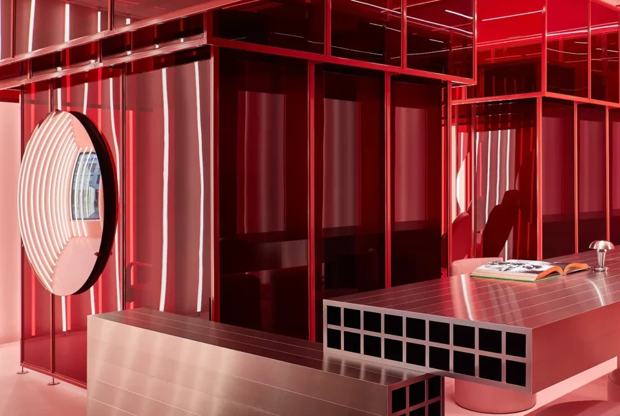 Aiming to shift the outmoded image of nonsurgical cosmetic procedures when launching her own injectables clinic, Megan Kozak enlisted Alex Simpson and Jayme Million—co-founders of local practice Studio Author—to craft a daring space for her clinic, PoutX on Toronto’s King Street East. “We knew it needed to be bold,” Simpson explains. And so the decision to go with a particular red lifted from Kozak’s signature lip tone was selected to anchor PoutX’s graphic identity. With nods to flagship stores of global fashion brands like Acne and Balenciaga, where materials are unexpectedly layered, the effect, Million suggests, is more akin to a Berlin nightclub than a medical clinic. A prism of floating crimson acrylic partitions and vertical bands of neon lighting frame the processes behind Kozak’s patented Botox method, Architox (a technique that customizes dosage based on muscle size and strength, preventing overcompensation).