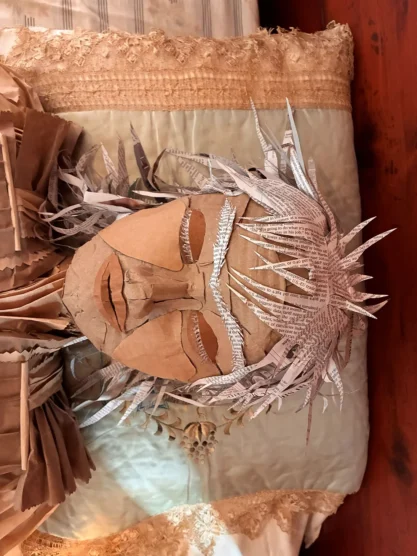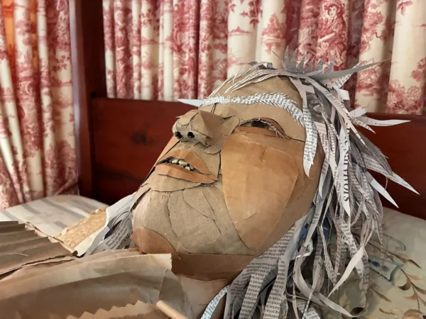 An eerie human-like cardboard figure lies on a bed in the master bedroom of the Oakville Museum at Erchless Estate, eyes half-open, mouth baring teeth with paper hair that resembles spikes. Nearby, a table holds pencils and paper, with just one question: What keeps you up at night? Look closely at this effigy, embodying insomnia, and there is a slit for visitors to put the papers, detailing their fears, anxieties, and restless thoughts, into its hollow chest.