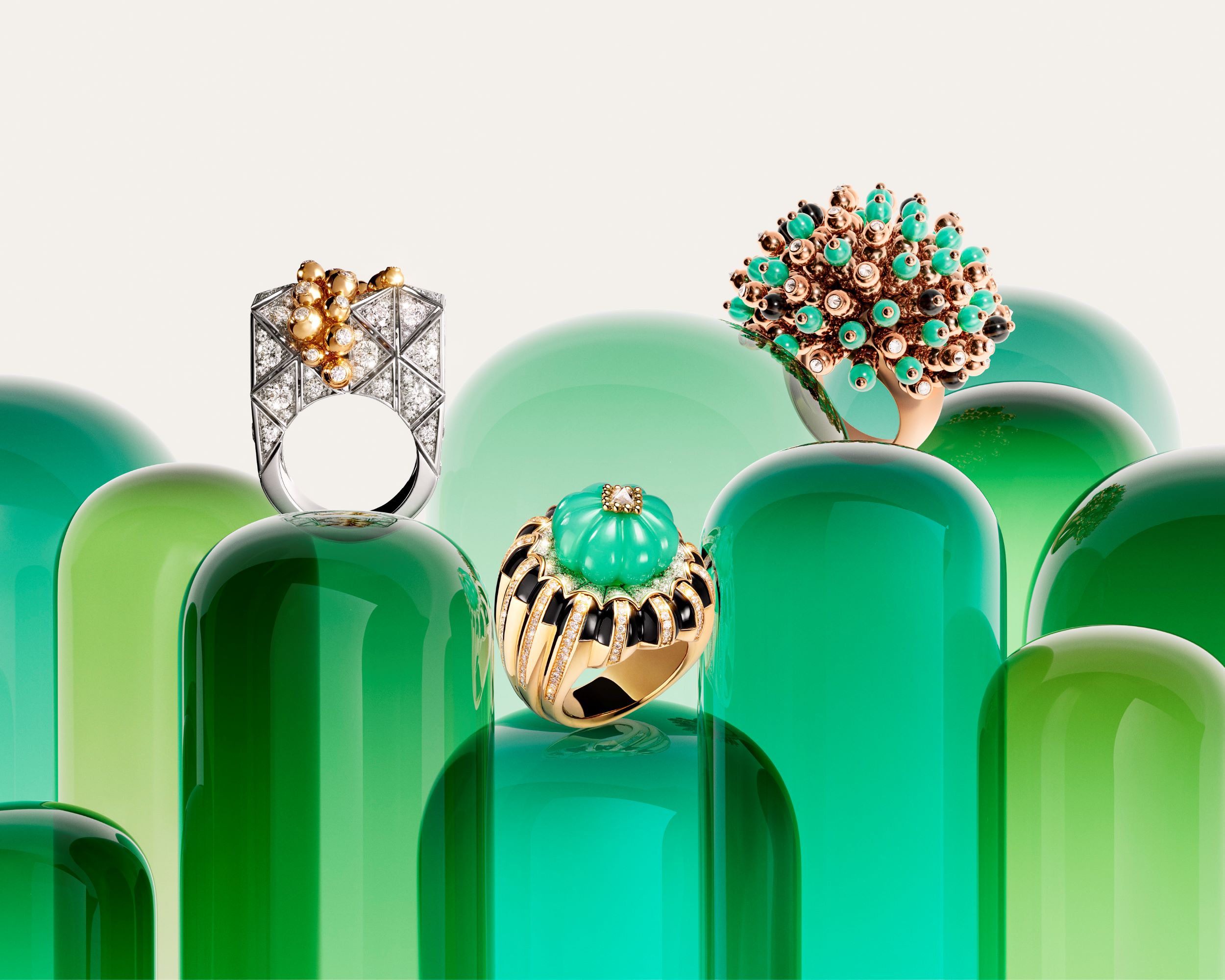 First came Tutti Frutti and now Tutti Tutti, the latest addition to the Cartier Libre Collection. The watchmaking, jewellery, and accessories design studios for Cartier Libre have the creative freedom to reinvent house motifs through a contemporary lens, and this year Tutti Tutti is in the spotlight. With innovative designs, bright colours, and unexpected volumes, the Tutti Tutti pieces delight and surprise with gemstones sculpted in various shapes or cut into cabochons. Black onyx, white diamonds, and green chrysoprase recall the art deco palette that has been a Cartier signature since the 1920s, while a ring and bracelet suite inspired by the Cartier Coussin watch feature a pavé setting of sapphires in a cameo of pastel shades. As the name Tutti Tutti translates, this is a collection that leaves you wanting “Everything, Everything.”