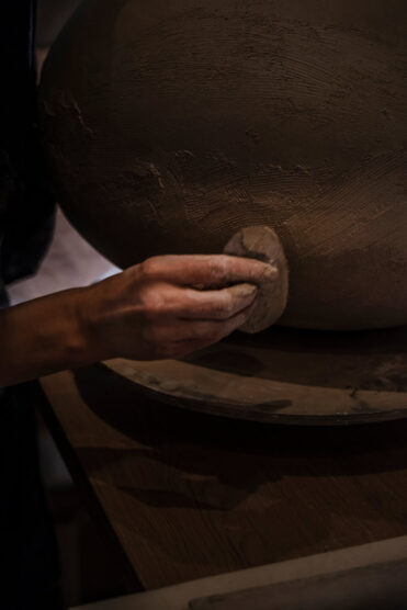 Whenever possible, Pasquino goes out and digs for her own clay. “It’s important to appreciate the natural state of the material,” she says. The four months Pasquino spent in Japan set the foundation for “artistic freedom and how you treat the material like a living organism. You don’t slap clay on the table—you just don’t. You embrace the irregularities that come.” While Pasquino is constantly experimenting with various types of clay, she prefers a monochromatic colour palette for her orb vessels. “I like earthy colours,” she says, but even so, she has produced black and terra cotta red works.