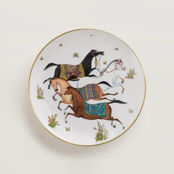 The festive season calls for showcasing fine tableware, and this porcelain dessert plate is part of the maison’s 55-piece Cheval d’Orient collection, an homage to the maison’s equestrian heritage. Hermès worked with French artist Nathalie Rolland-Huckel, who was inspired by the Persian miniatures from the Silk Road in the 15th and 16th centuries, illustrating free-running horses wearing ceremonial blankets. This design, amongst others from the maison, is applied using serigraphy and by hand using a gold thread. Whether to be used as a part of a tablescape or simply for decorative purposes, this plate is sure to be a conversion starter at the dinner table.