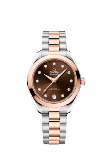 All the watches have a metal bracelet—steel, Sedna Gold, Moonshine Gold, and two-tone options—and a variety of dial colours, including black, grey, blue, purple, brown, green, champagne, and mother-of-pearl. Each has applied hour markers, as well as a date window at six o’clock along with Omega’s patented screw-and-pin system that features a butterfly clasp with side pushers and a two-millimetre comfort-adjustment feature plus the option of diamond-set bezels.