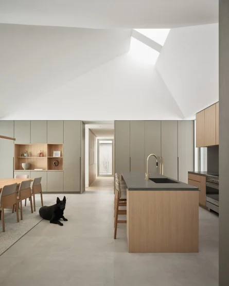This indoor-outdoor connection is a strong focus throughout the architecture. Skylights along the vaulted ceiling fill the home with ample natural light and bring the outdoors in. The primary bathroom looks onto a courtyard in the centre of the home that provides an added vantage point onto nature. This courtyard is situated where the sloped roof dips and is demarcated by wooden slats, adding additional visual interest.