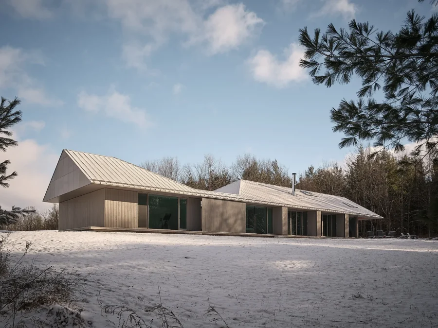 Ridge House‘s distinctive roof is a reminder of the sloped landscape the home is set upon, at the boundary between a field and the edge of a forest. Superkül strategically used the shape of the land for privacy as well as to maximize the views, “optimizing visual and physical connections to the ironwood and pine forest at the edge of the clearing,” as the studio states.