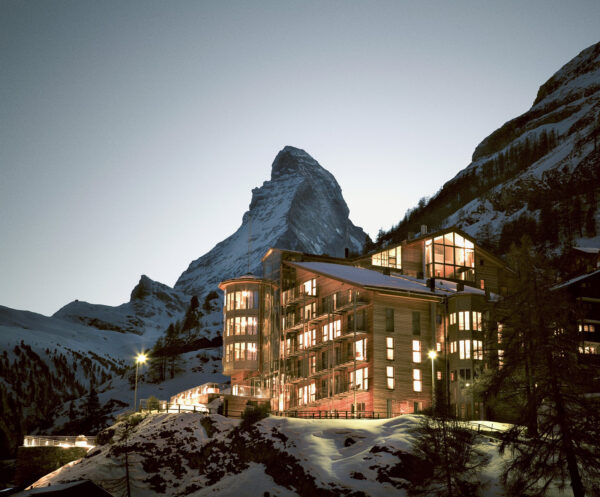 The 30-key Omnia hotel is built on a rock overlooking Zermatt. The wood-and-glass-façade structure is a contemporary interpretation of the classic mountain lodge.