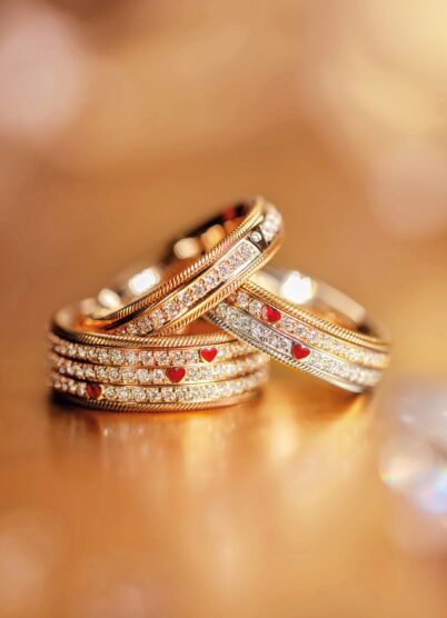Distinguished by its rich cold-enamel designs and silky gold ropes, Wellendorff jewellery indicates that the wearer appreciates the timeless. The Three Hearts One Love ring is three spinning diamond runners, each featuring a small red heart in one 18-karat gold band. The three hearts represent three of your passions, three —important moments in your life, or that two people have become a family is the narrative Wellendorff communicates.